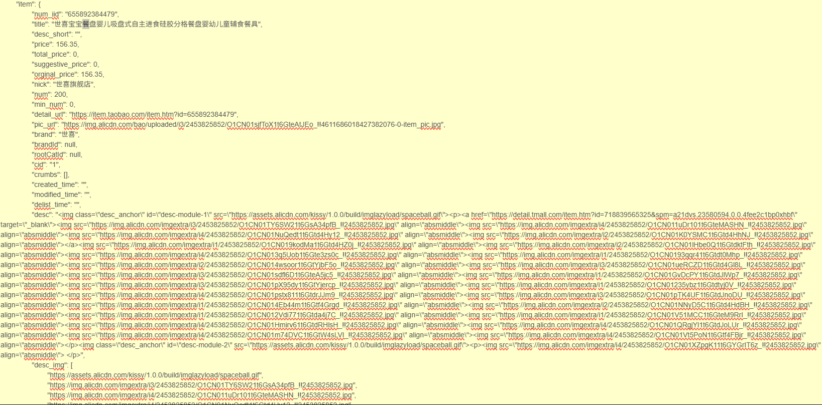 item[] | 1 | 宝贝详情数据【部分商品获取不到(药品、五金、天猫国际、百亿补贴类等)】 | |